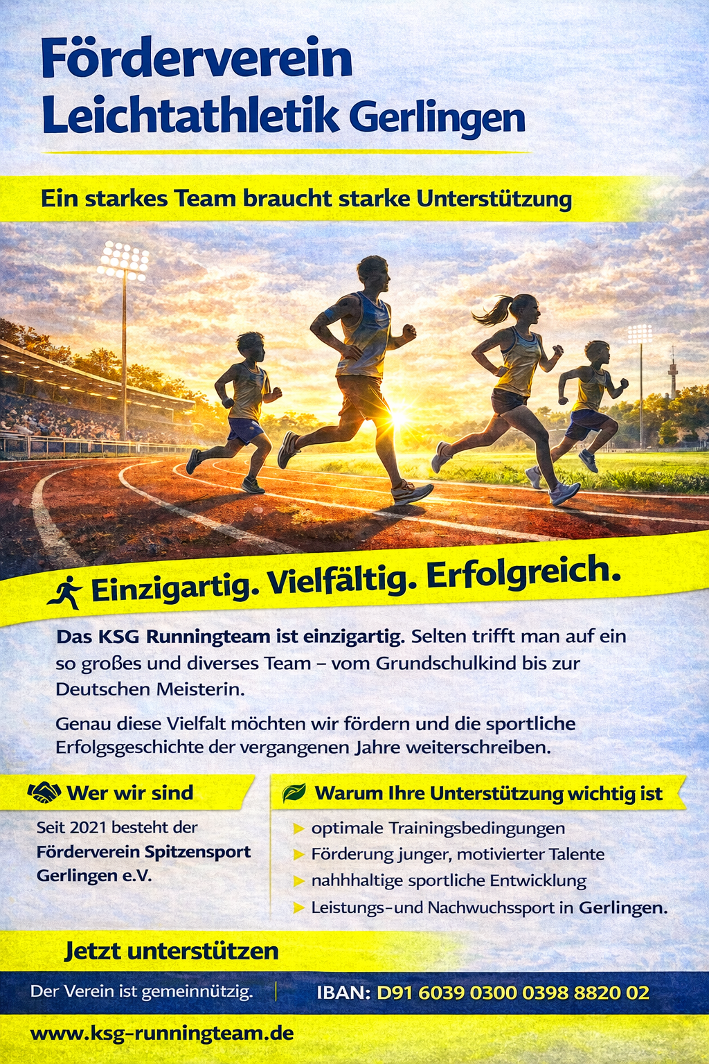 Seit 2021 besteht der Förderverein Spitzensport Gerlingen e.V. Der Zweck des Vereins ist die idelle und finanzielle Förderung der Abteilung Leichtathletik Sprint&Lauf der KSG Gerlingen.