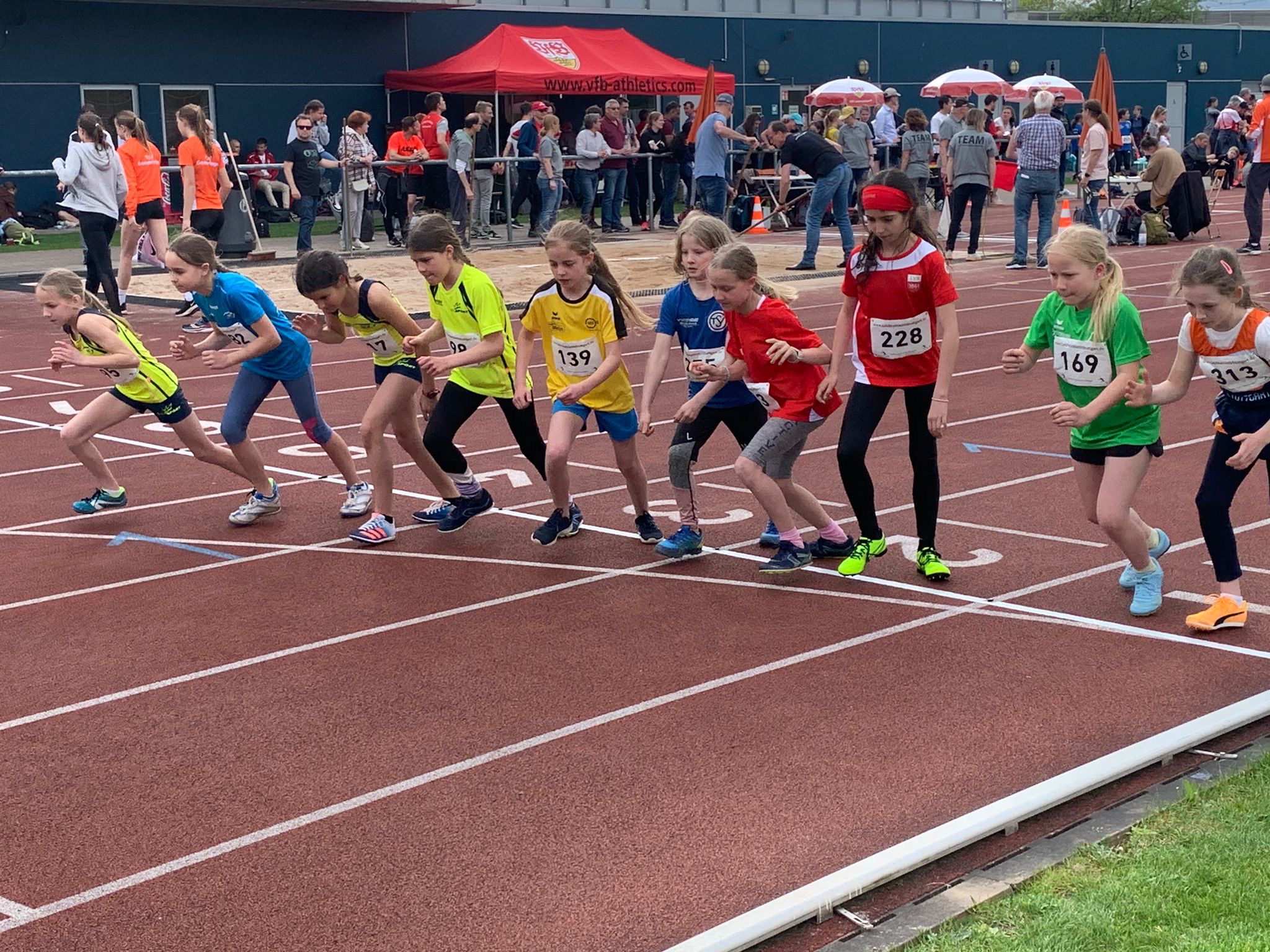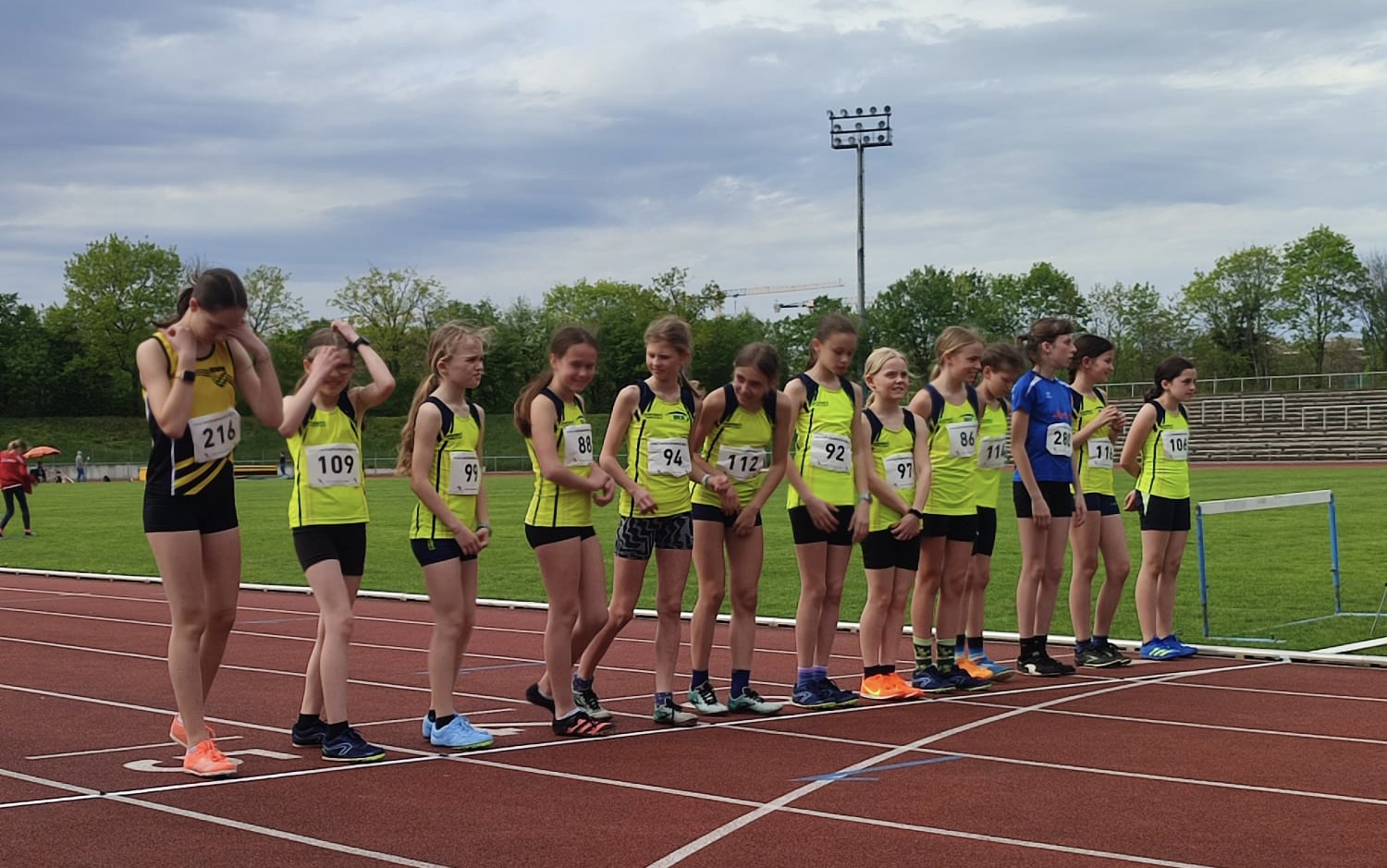 Aneinandergereiht wie eine gelbe Perlenschnur flitzten die Mädels U12/U14 im 800m Lauf über die Bahn. In unglaublich hohem Tempo zeigten sie allen Zuschauern, dass hier das beste Nachwuchslaufteam Deutschlands am Start ist. Die Mädchen der Kinder- und Jugendgruppen des Runningteams, Anja Hugel, Selina Lässig, Katharina Wendling, Maja Höck, Milla Rinne, Elena Porcu, Pauline Holder, Laura Knagge, Leyla Sentürk, Clarissa Schlegel, Merle Steinmann, Leni Höck, Marietta Elhardt, Inara Gluhalic, Janka Mosler, Anna-Lena Wendling, Louise Schäfer und Ellen Pfeiffer zeigten eine Topform, die alle Mitgereisten stauen lies.