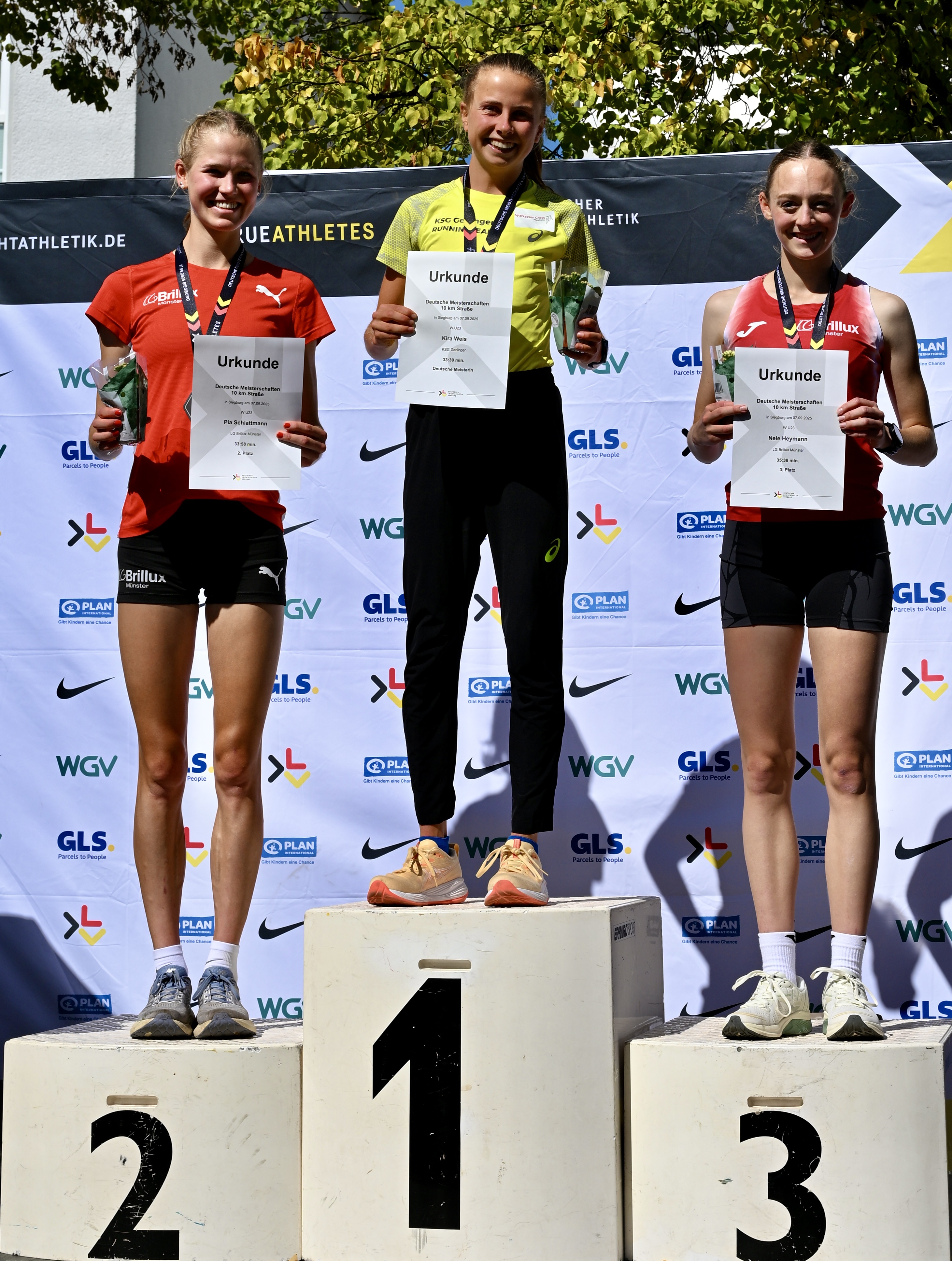Dort hielt einmal mehr unsere internationale Spitzenläuferin Kira Weis die Fahne der KSG hoch. Die 21-Jährige war direkt aus dem Asics-Trainingscamp im französischen Font-Romeu angereist und stand am Sonntagmorgen um 11 Uhr an der Startlinie des 10 km Rennens. Von Beginn an lief sie in der Spitzengruppe mit. Im Ziel war sie nur eine Minute hinter Konstanze Klosterhalfen und hatte einen deutlichen Vorsprung auf die zweitplatzierte Läuferin ihrer Altersklasse. Kira sicherte sich somit souverän den Titel in der U23 – ihren bereits 13. Deutschen Meistertitel. Damit krönt sie eine ohnehin herausragende Saison, die mit dem Gewinn der Silbermedaille bei der U23-Europameisterschaft bereits ein sportliches Highlight verzeichnete.