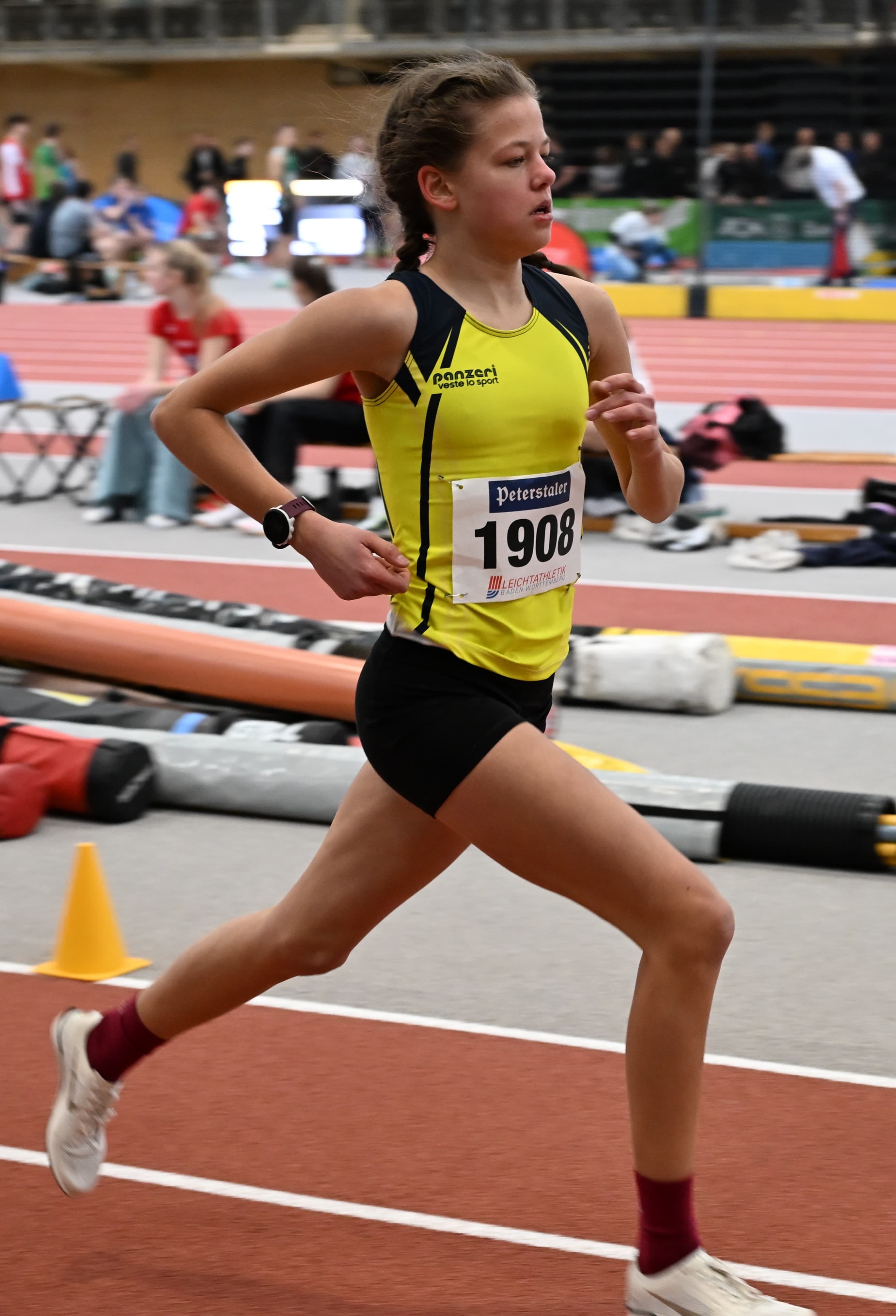 Am vergangenen Wochenende stand für die Sportler unseres Runningteams bereits der erste Saisonhöhepunkt an: die BW-Hallenmeisterschaft in der Karlsruher Europahalle. Qualifiziert hatten sich für die 1.500m in der U18 Anna-Lena Wendling sowie Merle Steinmann. Letztere durfte aufgrund ihrer herausragenden Vorleistung als erst 14-Jährige in der höheren Altersklasse starten. Unerschrocken hielt Merle von Anfang an in der Spitzengruppe mit und musste sich am Ende mit dem einerseits ärgerlichen, andererseitsaber mehr als ehrenhaften vierten Platz zufriedengeben. Geschlagen nur um eine halbe Sekunde, aber mit klarer neuer Bestzeit von 4:53 Minuten, die ihr deutschlandweit aktuell den dritten Platz in der Bestenliste ihres Jahrgangs einbringen. Anna-Lena steigerte sich um satte sieben Sekunden und konnte Rang 6 erringen – drei Plätze über der Setzliste. In der U20 hatten es Ellen Pfeiffer und Alice Klaus zum Finale in die Fächerstadt geschafft. Dort konnten sie beide ihrem Zeitlauf den Stempel aufdrücken. Zunächst übernahm Alice gewohnt stürmisch die Führung, später zog Ellen vorbei und holte sich den Sieg. Leider schrammten beide knapp an der Qualifikationszeit für die Deutsche Meisterschaft vorbei. Unsere Ausnahmeathletin Kira Weis, die normalerweise auf längeren Strecken zu Hause ist, nutzte den Wettkampf auf Landesebene, um sich aerobe Kraft und Tempohärte zu holen. Als U23-Athletin trat sie bei den Frauen an und belohnte sich über die 1.500m für einen mutigen Auftritt mit dem vierten Platz. Zwar keine Medaille, aber ein gutes Gefühl! Über die noch kürzeren 800m, über die sie ebenfalls am Start war, reichte es in neuer persönlicher Hallenbestzeit von 2:17 min für Platz sechs. Auch Leyla Sentürk hatte als U16-Läuferin die Qualifikation für die U18 geschafft. Über die 800m zeigte sie keinerlei Respekt vor den älteren Starterinnen und ließ fast alle etablierten Athletinnen hinter sich. Nach einem tollen Rennen überquerte sie nur zwei Sekunden hinter der Ersten die Ziellinie und durfte damit bei der Siegerehrung das Bronzetreppchen besteigen. Unsere Herrenstaffel über die 4 x 400m trat erstmals in der Besetzung Felix Jockel, Adam Kulik, Levi Schäfer und Leonard Henke an. Obwohl mit Abstand jüngstes Team im Feld lieferten sie den erwachsenen Quartetten der anderen Vereine einen harten Fight und belegten Gesamtrang 6. Das Mixed-Team bestehend aus Ellen, Maike Amler, Alex Fanaras und Franz Ruff hatte es mit teilweise herausragender Konkurrenz zu tun. Davon ließen sie sich aber nicht schrecken und wurden letztlich sogar Fünfter. Unter dem Strich haben die Läuferinnen und Läufer in den neongelben Trikots unserem Runningteam einmal mehr alle Ehre gemacht und mit tollen Leistungen landesweit Ausrufezeichen gesetzt. Das macht große Hoffnungen für das Laufjahr 2026!