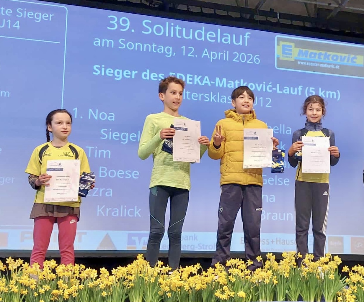 Tobias Lang, Eckhard Lindemann, Karina Morchner-Lips, Engin Schmidt, Martin Schromm und Marco Steinmann wagten sich auf den 21,1 km langen Halbmarathon und stellten dort allesamt unter Beweis, dass sie in den Wochen zuvor ordentlich Kilometer gebolzt hatten. Tobias rannte in der U20 sogar allen Konkurrenten davon und belegte den ersten Platz! Das Pensum von 10 km des BMW-Müller-Laufs trauten sich Stefan El Mansy-Rinne, Stephan Maisch, Daniel Obermüller, Andreas und Birgit Schäfer, Marc Schulze und Corina Wagner zu. Marc lief dabei völlig losgelöst und ließ keinen Altersgenossen auch nur den Hauch einer Chance. Rang 1 in der M50 und der zweite Platz imsgesamt waren der verdiente Lohn. Lieber kürzer, aber dafür schneller war das Motto für unsere 23 Starter beim von Edeka Matkovic gesponserten „Fünfer“. Julius Abel, Markus Dach, Constantine Gelse, Philipp Herud, Emil Hössl, Anja Hugel, Laura Knagge, Sebastian Kranz, Hagen Lindemann, Isabella und Laura Saak, Benjamin Sauren, Christian Schimmang, Greta Schönbucher, Raffael Seibold, Andrea Stolz-Lindemann, Klara-Luise Stumpp, Carl Tisch, Aya und Hugo Trick, Mania Vesali sowie Lilli und Tom Zuleck hatten die Wettkampfschuhe geschnürt und nutzten die tendenziell bergabführende Strecke für erstklassige Zeiten. Geradezu unfassbare sechs erste Plätze holten sie für unser Team: Greta als Gesamtsiegerin, Julius, Tom, Anja, Hagen und Isabella siegten in ihren Altersklassen; Constantine und Laura wurden Zweite, Sebastian und Christian sicherten sich Bronze.