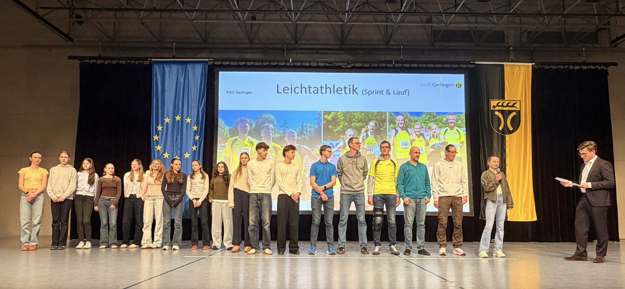 38 Leichtathleten aus unserer Abteilung wurden bei der gestrigen Gerlinger Sportlerehrung für herausragende Leistungen im Jahr 2025 ausgezeichnet. Allen voran glänzte Kira Weis, aktuell die erfolgreichste Leichtathletin der KSG. Die Ausnahmeathletin sorgte im vergangenen Jahr erneut international für Furore: Zwei Vize-Europameistertitel in der U23-Klasse sowie ein deutscher Meistertitel über 10.000 Meter unterstreichen ihre starke Entwicklung.Die Krönung ist die erneute Berufung in den Deutschen Perspektivkader für Olympia 2028. Ebenfalls im Langstreckenlauf war Max Klaus erfolgreich: In der Klasse M60 sicherte er sich den Titel des Deutschen Vizemeisters im Marathon. Für ein echtes Top-Resultat im Mittelstreckenlauf sorgten die Mädchen der Klasse U14: Über 3x800 Meter stürmten Pauline Holder, Romy Schäfer umd Janka Mosler geradewegs an die Spitze der Deutschen Bestenliste. Auch im Gelände wusste das KSG-Runningteam zu überzeugen. Die Crosslaufmannschaft U20 mit Ellen Pfeiffer, Greta Schönbucher und Alice Klaus erkämpfte sich bei den Deutschen Crosslaufmeisterschaften einen starken vierten Platz in der Mannschaftswertung.Eine weitere nationale Spitzenplatzierung steuerte Lisa Maisch bei: Mit Rang fünf bei den Deutschen Berglaufmeisterschaften reihte sie sich ebenfalls in Deutschlands Elite ein. Es war ein rundum gelungener Abend, durch den Bürgermeister Dirk Oestringer führte. Er würdigte die Leistungen der Sportlerinnen und Sportler und betonte die enorme Bedeutung des Sports für das gesellschaftliche Leben in Gerlingen.
