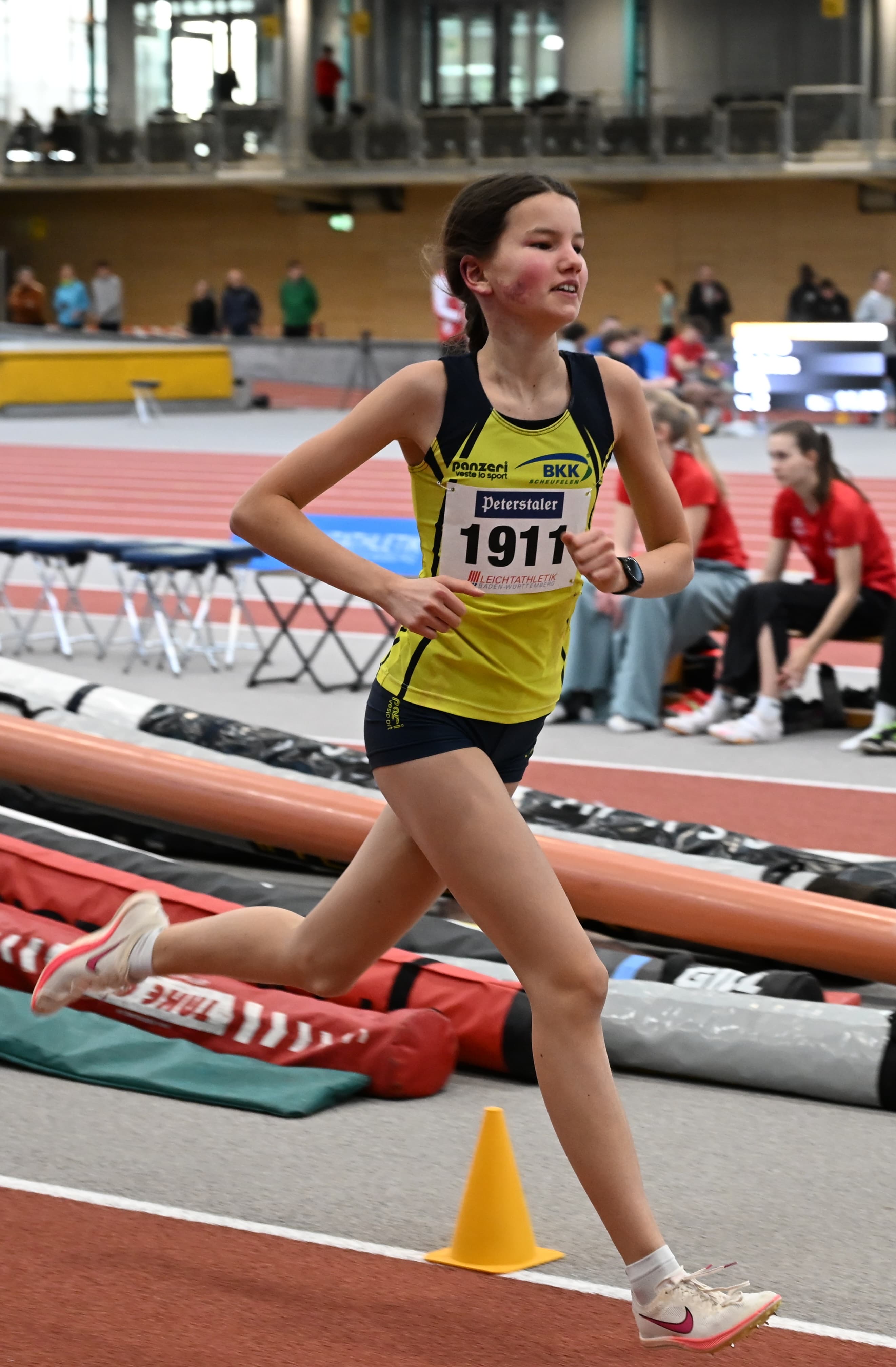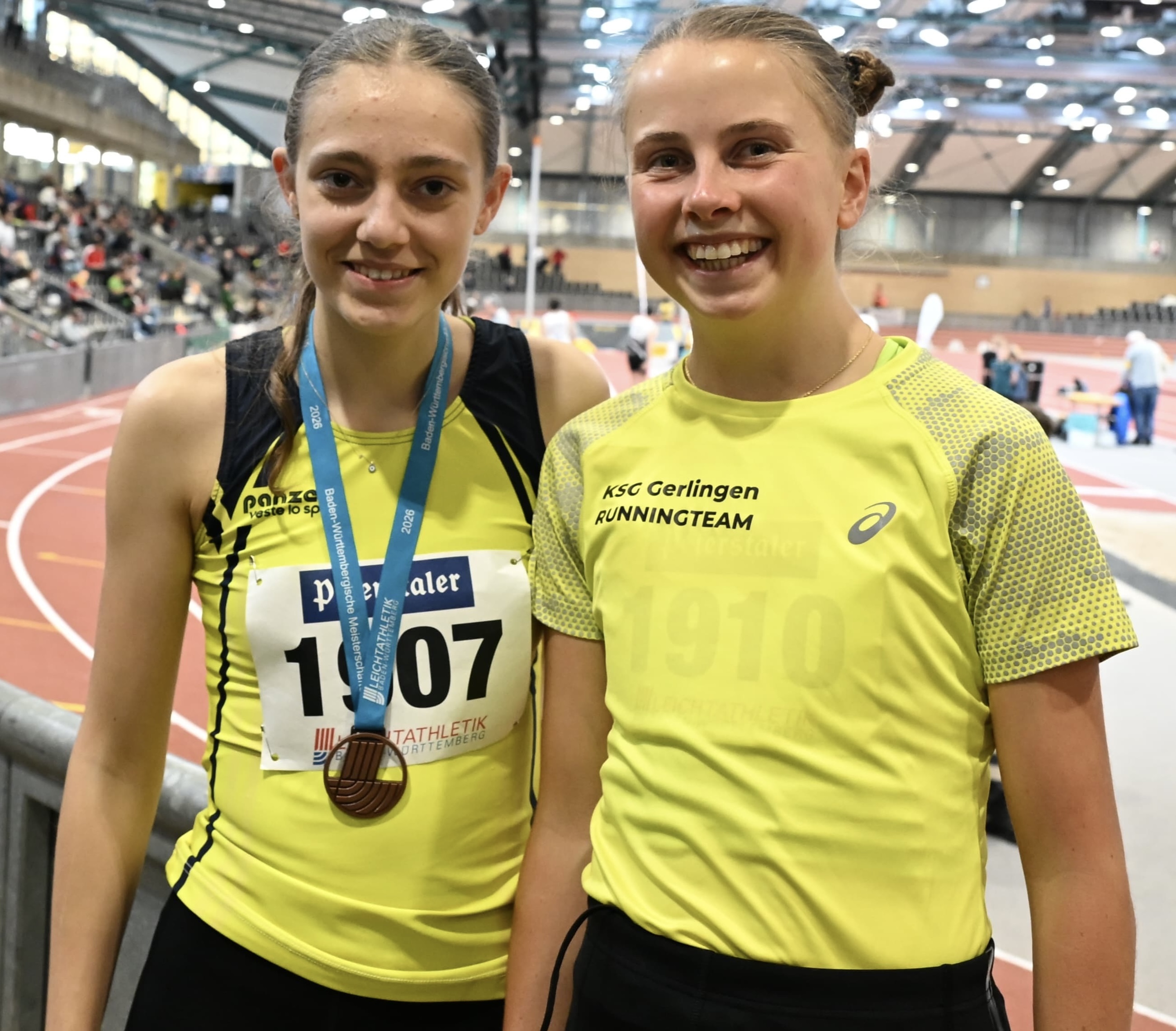 Am vergangenen Wochenende stand für die Sportler unseres Runningteams bereits der erste Saisonhöhepunkt an: die BW-Hallenmeisterschaft in der Karlsruher Europahalle. Qualifiziert hatten sich für die 1.500m in der U18 Anna-Lena Wendling sowie Merle Steinmann. Letztere durfte aufgrund ihrer herausragenden Vorleistung als erst 14-Jährige in der höheren Altersklasse starten. Unerschrocken hielt Merle von Anfang an in der Spitzengruppe mit und musste sich am Ende mit dem einerseits ärgerlichen, andererseitsaber mehr als ehrenhaften vierten Platz zufriedengeben. Geschlagen nur um eine halbe Sekunde, aber mit klarer neuer Bestzeit von 4:53 Minuten, die ihr deutschlandweit aktuell den dritten Platz in der Bestenliste ihres Jahrgangs einbringen. Anna-Lena steigerte sich um satte sieben Sekunden und konnte Rang 6 erringen – drei Plätze über der Setzliste. In der U20 hatten es Ellen Pfeiffer und Alice Klaus zum Finale in die Fächerstadt geschafft. Dort konnten sie beide ihrem Zeitlauf den Stempel aufdrücken. Zunächst übernahm Alice gewohnt stürmisch die Führung, später zog Ellen vorbei und holte sich den Sieg. Leider schrammten beide knapp an der Qualifikationszeit für die Deutsche Meisterschaft vorbei. Unsere Ausnahmeathletin Kira Weis, die normalerweise auf längeren Strecken zu Hause ist, nutzte den Wettkampf auf Landesebene, um sich aerobe Kraft und Tempohärte zu holen. Als U23-Athletin trat sie bei den Frauen an und belohnte sich über die 1.500m für einen mutigen Auftritt mit dem vierten Platz. Zwar keine Medaille, aber ein gutes Gefühl! Über die noch kürzeren 800m, über die sie ebenfalls am Start war, reichte es in neuer persönlicher Hallenbestzeit von 2:17 min für Platz sechs. Auch Leyla Sentürk hatte als U16-Läuferin die Qualifikation für die U18 geschafft. Über die 800m zeigte sie keinerlei Respekt vor den älteren Starterinnen und ließ fast alle etablierten Athletinnen hinter sich. Nach einem tollen Rennen überquerte sie nur zwei Sekunden hinter der Ersten die Ziellinie und durfte damit bei der Siegerehrung das Bronzetreppchen besteigen. Unsere Herrenstaffel über die 4 x 400m trat erstmals in der Besetzung Felix Jockel, Adam Kulik, Levi Schäfer und Leonard Henke an. Obwohl mit Abstand jüngstes Team im Feld lieferten sie den erwachsenen Quartetten der anderen Vereine einen harten Fight und belegten Gesamtrang 6. Das Mixed-Team bestehend aus Ellen, Maike Amler, Alex Fanaras und Franz Ruff hatte es mit teilweise herausragender Konkurrenz zu tun. Davon ließen sie sich aber nicht schrecken und wurden letztlich sogar Fünfter. Unter dem Strich haben die Läuferinnen und Läufer in den neongelben Trikots unserem Runningteam einmal mehr alle Ehre gemacht und mit tollen Leistungen landesweit Ausrufezeichen gesetzt. Das macht große Hoffnungen für das Laufjahr 2026!