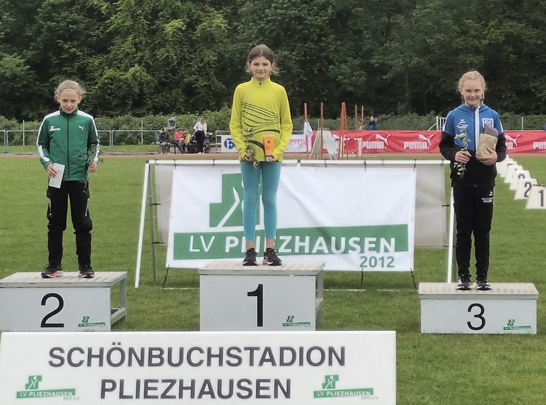Als Letzte unseres Teams durfte "the rising star" Jasmin auf die Tartanbahn. Erneut hieß ihre Hauptkonkurrentin dabei Noelie Möck aus Pliezhausen, gegen die sie unter der Woche in Renningen noch gewonnen hatte. Diesmal mischte aber eine dritte Läuferin mit. Diese bekriegte sich regelrecht mit Möck, es wurde gerempelt und gestoßen. Jasmin hielt sich aus der Sache heraus und verfolgte das Geschehen entspannt dahinter. Was der Reporter allerdings falsch interpretierte: "Kuhn scheint ein wenig geschlagen." Gut 100 Meter vor dem Ziel löste Jasmin dann aber alle Bremsen und ging "mit einem absoluten Schlussspurt" auf die Überholspur. Am Ende stand logischerweise der verdiente Sieg! Und als Belohnung gab es immerhin einen stilvollen Lorbeerzweig (mit praktischem Duschgel ...).