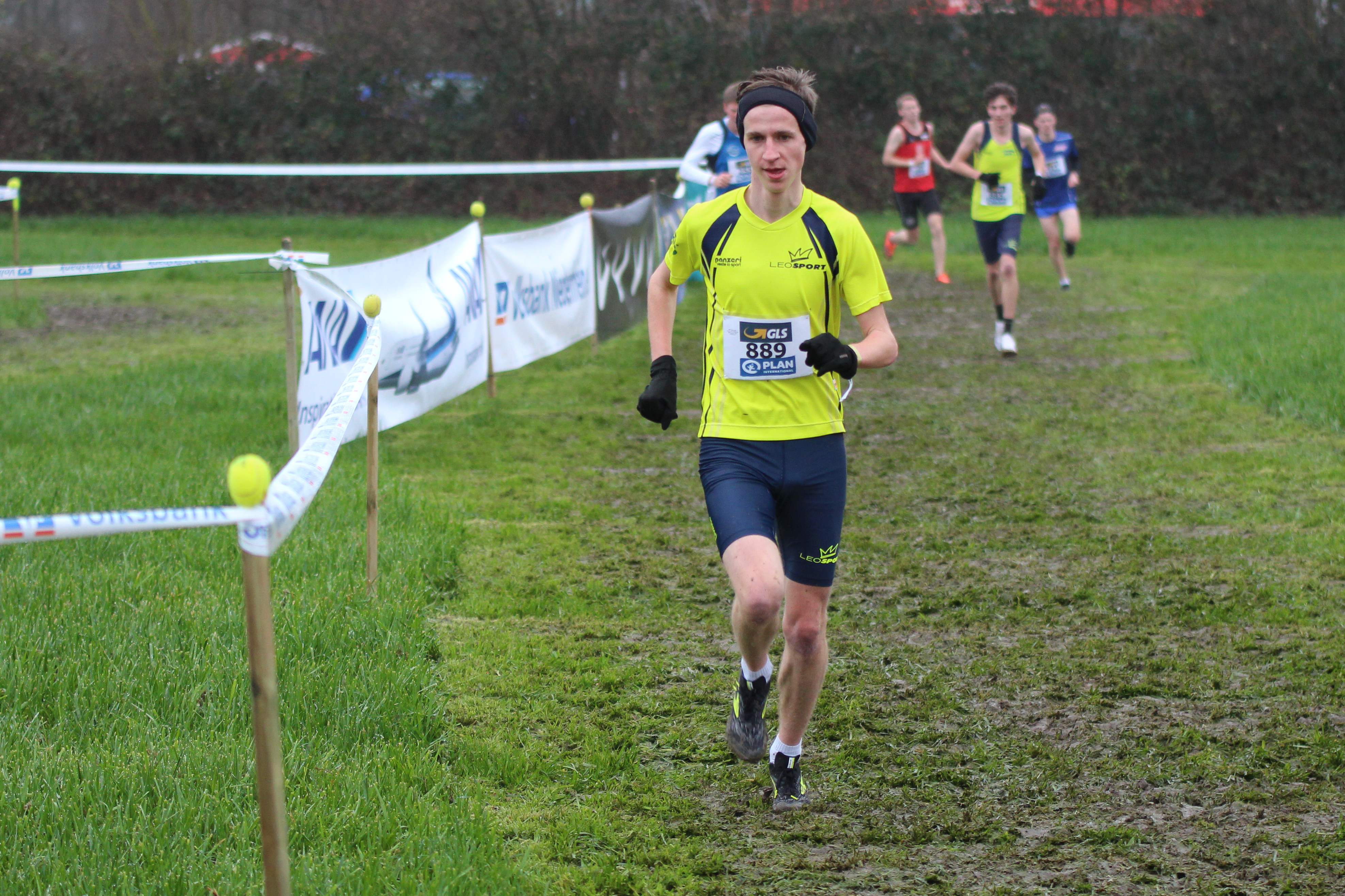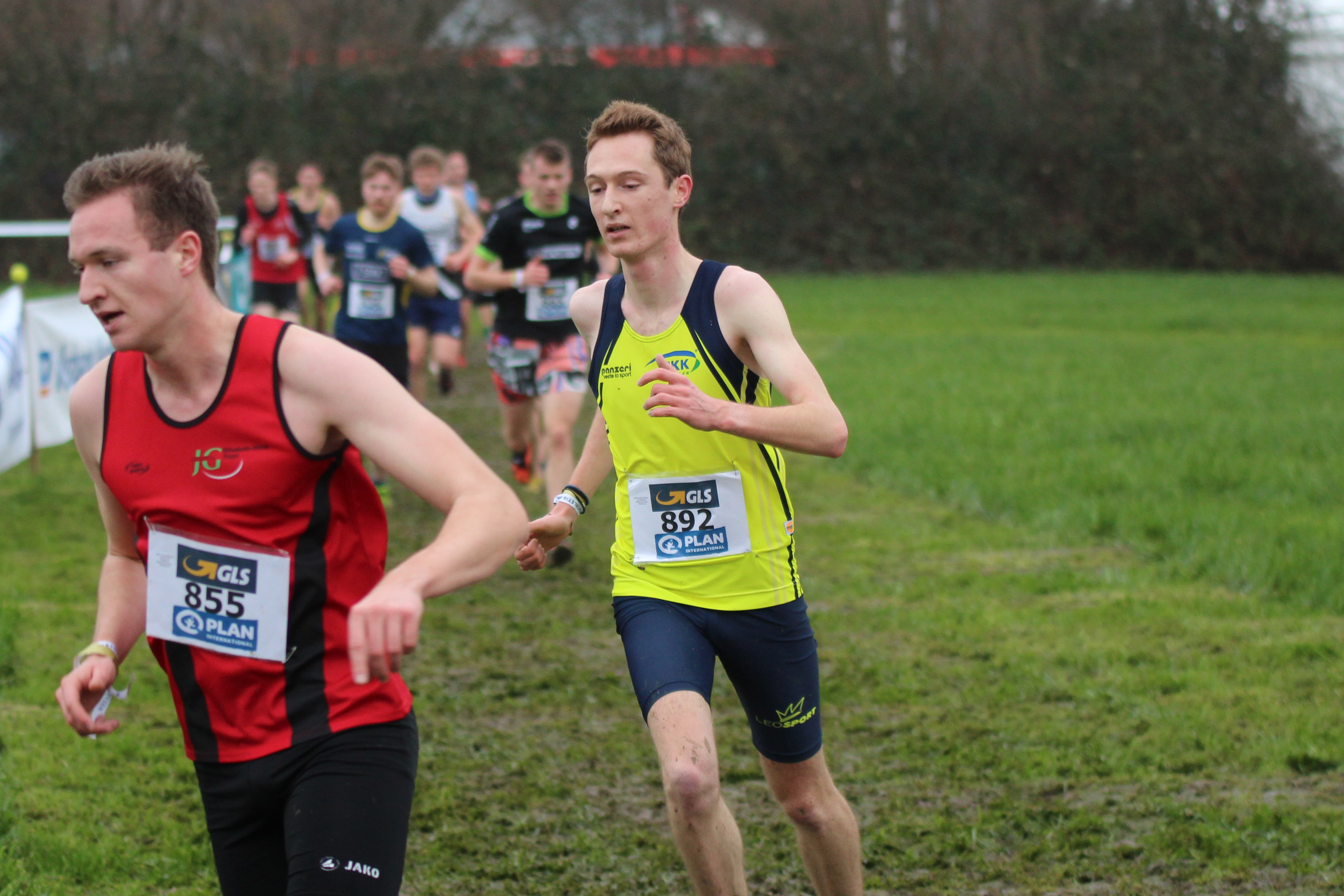 Über die gleichen 4,1 km gingen auch ein Trio der männlichen U23 auf die, nach einem weiteren Lauf, in manchen Kurven schon ungleich matschigeren Strecke. Wie wohl die meisten Athleten des 150-köpfigen Felds im gemeinsamen Mittelstreckenlauf der Männer und der U23, hatten die Mehrheit der in Gelb startenden Athleten zu den etwas längeren 12er-Nägeln gegriffen, um die engen Kurven der Strecke und den "Sonsbecker Hügel" gut navigieren zu können.