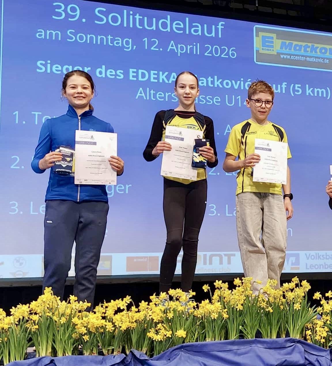 Tobias Lang, Eckhard Lindemann, Karina Morchner-Lips, Engin Schmidt, Martin Schromm und Marco Steinmann wagten sich auf den 21,1 km langen Halbmarathon und stellten dort allesamt unter Beweis, dass sie in den Wochen zuvor ordentlich Kilometer gebolzt hatten. Tobias rannte in der U20 sogar allen Konkurrenten davon und belegte den ersten Platz! Das Pensum von 10 km des BMW-Müller-Laufs trauten sich Stefan El Mansy-Rinne, Stephan Maisch, Daniel Obermüller, Andreas und Birgit Schäfer, Marc Schulze und Corina Wagner zu. Marc lief dabei völlig losgelöst und ließ keinen Altersgenossen auch nur den Hauch einer Chance. Rang 1 in der M50 und der zweite Platz imsgesamt waren der verdiente Lohn. Lieber kürzer, aber dafür schneller war das Motto für unsere 23 Starter beim von Edeka Matkovic gesponserten „Fünfer“. Julius Abel, Markus Dach, Constantine Gelse, Philipp Herud, Emil Hössl, Anja Hugel, Laura Knagge, Sebastian Kranz, Hagen Lindemann, Isabella und Laura Saak, Benjamin Sauren, Christian Schimmang, Greta Schönbucher, Raffael Seibold, Andrea Stolz-Lindemann, Klara-Luise Stumpp, Carl Tisch, Aya und Hugo Trick, Mania Vesali sowie Lilli und Tom Zuleck hatten die Wettkampfschuhe geschnürt und nutzten die tendenziell bergabführende Strecke für erstklassige Zeiten. Geradezu unfassbare sechs erste Plätze holten sie für unser Team: Greta als Gesamtsiegerin, Julius, Tom, Anja, Hagen und Isabella siegten in ihren Altersklassen; Constantine und Laura wurden Zweite, Sebastian und Christian sicherten sich Bronze.