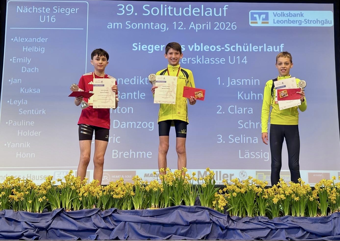 In der männlichen U14 machten sich von unserem Team Benedikt Bantle, Eric Brehme, Anton Damzog sowie Magnus und Mathis Spieler auf die Strecke. Bis vor Kurzem wären Benedikt und Eric sicher die Favoriten gewesen, doch urplötzlich ist Anton wie eine Naturgewalt vom Himmel gefallen und schraubt Rennen für Rennen seine Bestzeit nach unten. Und so war ein Dreikampf angesagt, der sich auf den letzten Metern zu einem hochdramatischen Fotofinish zwischen Benedikt und Anton entwickelte – mit dem um Millimeter besseren Ende für Benedikt. Das Siegertreppchen besetzte damit komplett unser Runningteam. Mathis und Magnus gingen indes gewohnt solide ans Werk und schafften es mit kühlem Kopf unter die Top Ten.