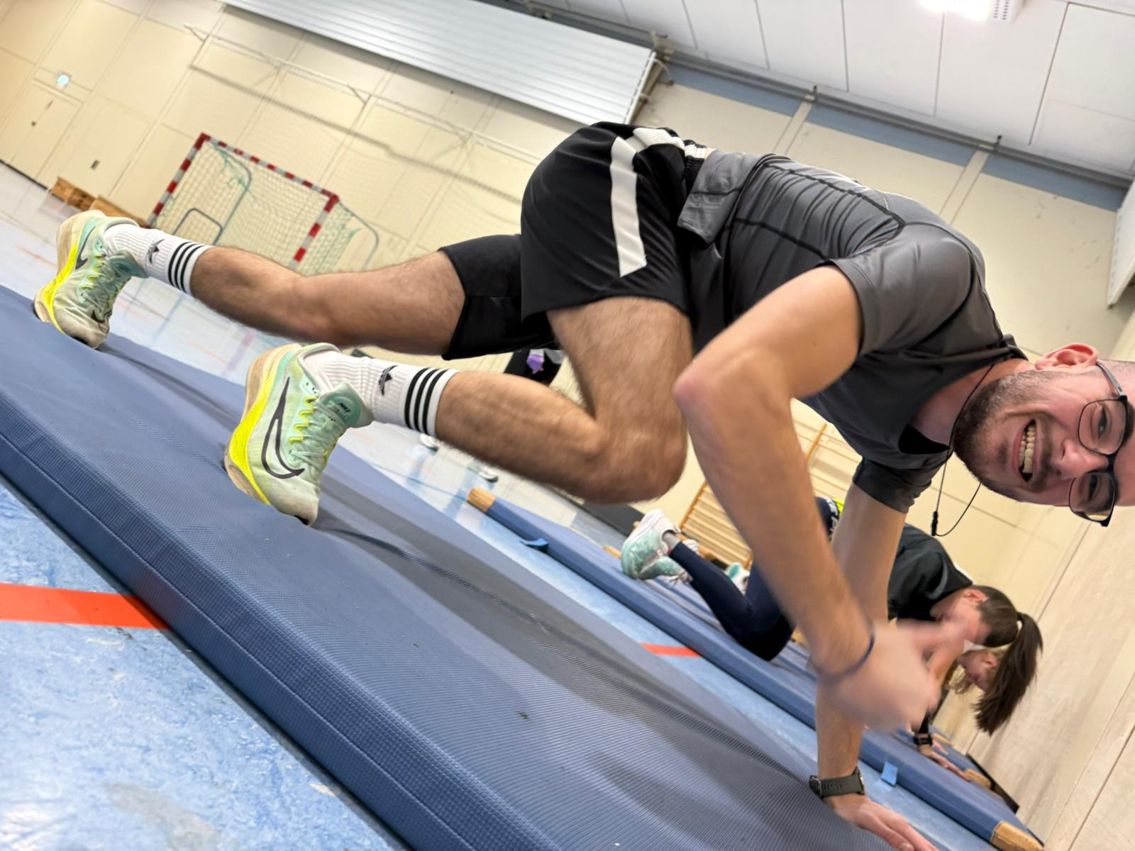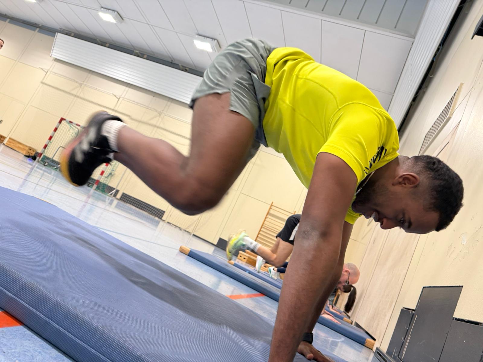 Heute morgen standen Tempoläufe in der coolen Leichtathletik Halle auf dem Programm. Im Anschluss haben wir Bergab-Läufe gemacht. Ein riesen Spaß: Start in der überhöhten Kurve und dann so schnell wie möglich losflitzen.